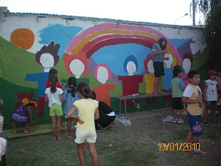 Las coordinadoras del Proyecto Pampares de la Sala Abierta de Lectura de Tandil me convocaron para hacer con los chicos del barrio Arco Iris, un taller de mural. Trabajamos sobre los derechos de los niños y el derecho al juego.
